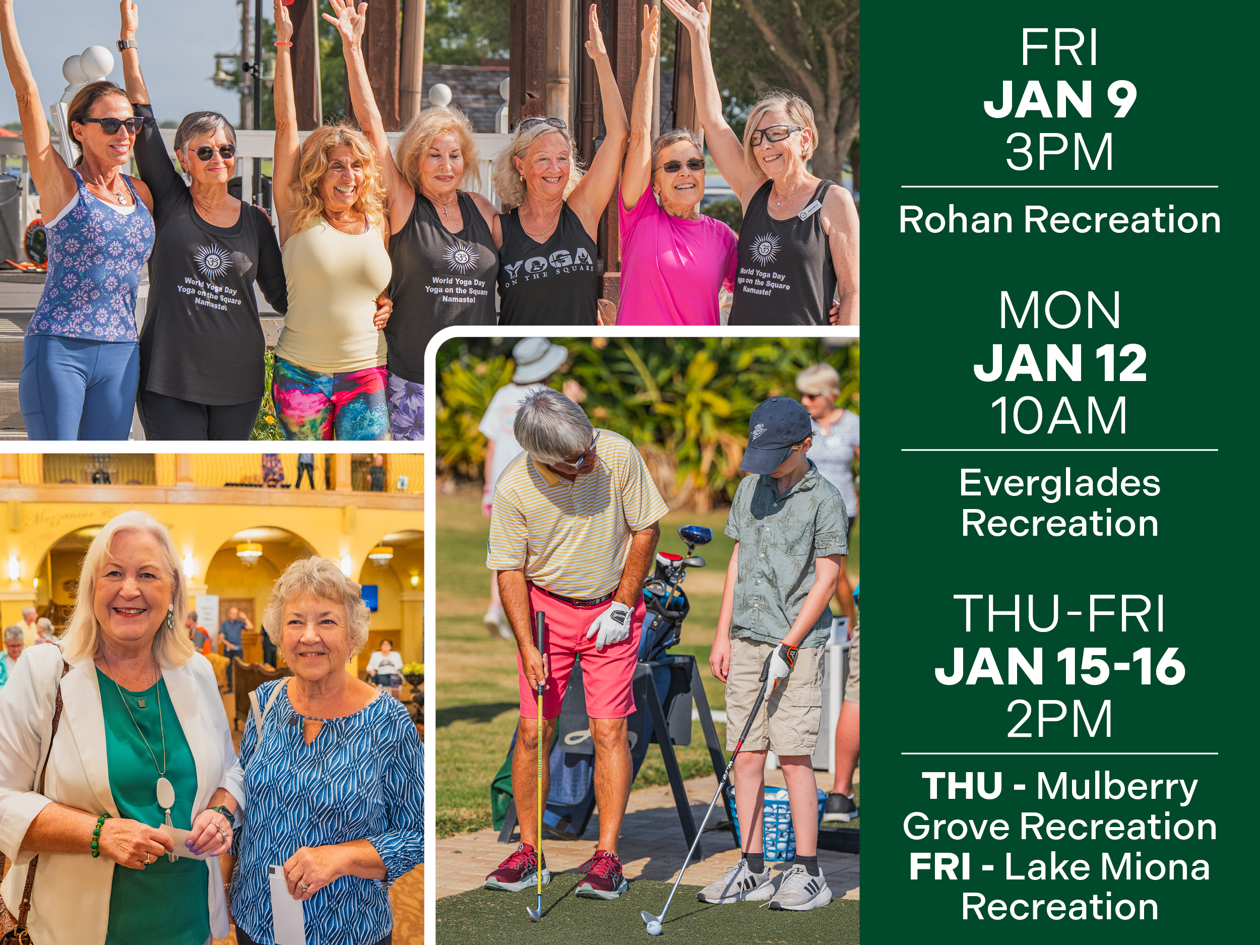 Calling all leaders, please join us at any of the resident lifestyle leaders’ meetings so we can bring you up to date on all happenings in Recreation & Parks.